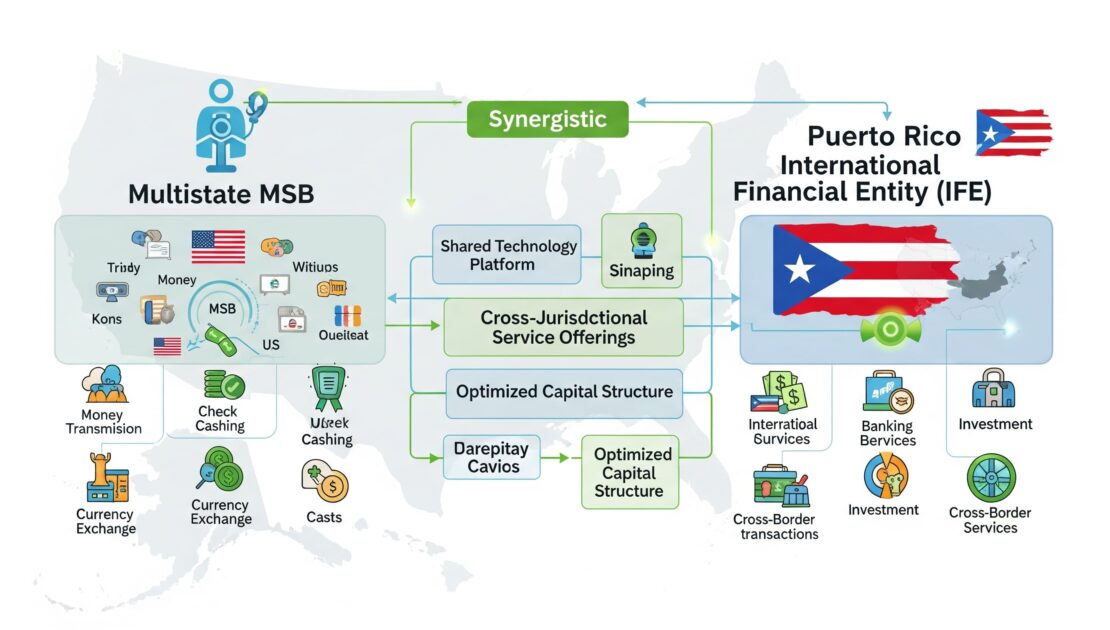 Combining the two creates a hybrid entity: The IFE handles international, non-resident-focused activities with tax efficiency, while the MSB arm manages U.S.-domestic transactions. This setup often involves a parent company or affiliated entities—one domiciled in Puerto Rico as an IFE and others registered as MSBs in key states. For instance, the IFE might custody assets or originate international loans, routing U.S.-related payments through the MSB to comply with state laws.